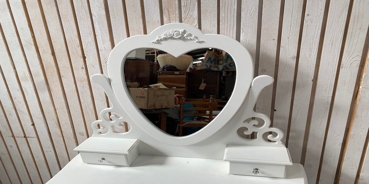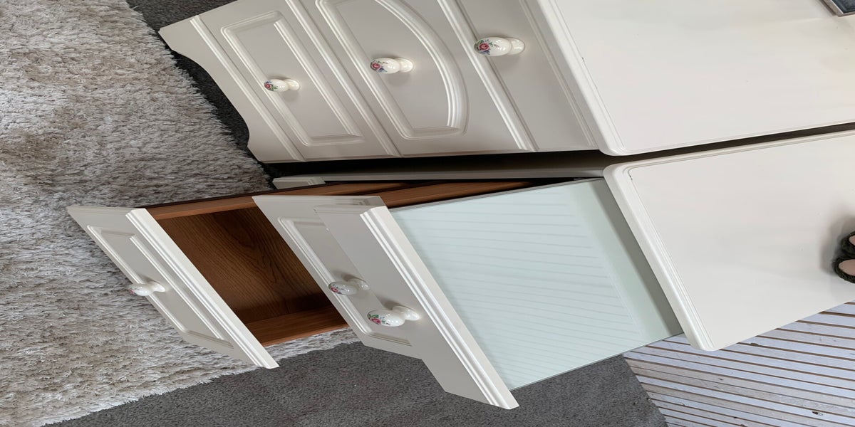 This white vintage bedroom set includes a wardrobe, dresser, and a set of three drawers, all in a retro style. The set is perfect for adding a touch of vintage charm to any bedroom, with its classic white colour and functional pieces for storage. The inclusion of drawers in the set adds practicality to the design, making it a stylish and practical choice for creating a cosy and organised bedroom space.(509B)