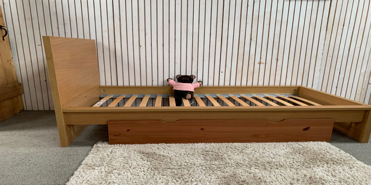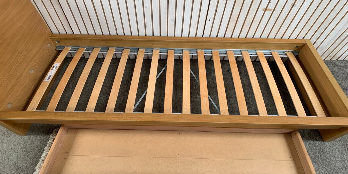 The Ikea Luroy Single Bed Frame in Oak is a stylish and minimalist addition to any adult's bedroom. Made from durable wood composite (MDF), this bed frame is designed to comfortably support a single mattress. With its sleek oak colour, it adds a fresh and modern touch to the room while seamlessly blending with any existing decor. Perfect for creating a clean and peaceful sleeping space, this bed frame is a practical choice for those looking for a reliable and elegant furniture piece with a drawer that fits underneath for extra storage.