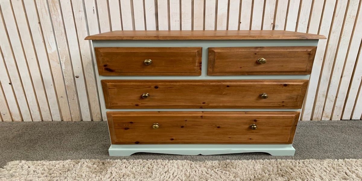 This upcycled chest of drawers is a charming addition to any bedroom or living space. Made from pine with a green colour and a Dark waxed top and drawer finish., it offers four spacious drawers for storage. The brass handles add a touch of elegance, while the dimensions of 73cm in height, 78cm in length, and 43cm in width make it a versatile piece of furniture. Perfect for adding a pop of colour and character to your home decor.(579)