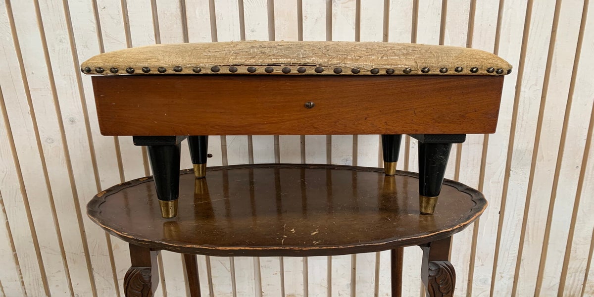 Sewing box stool containing sewing items inside. H34 W49 D35