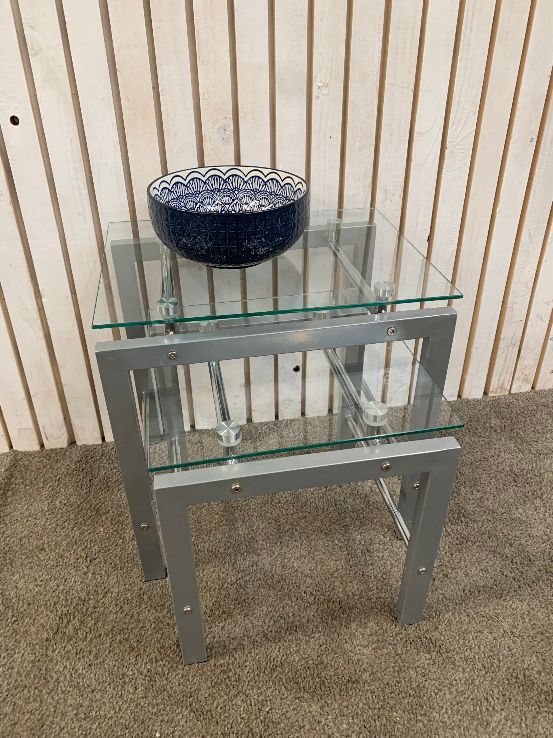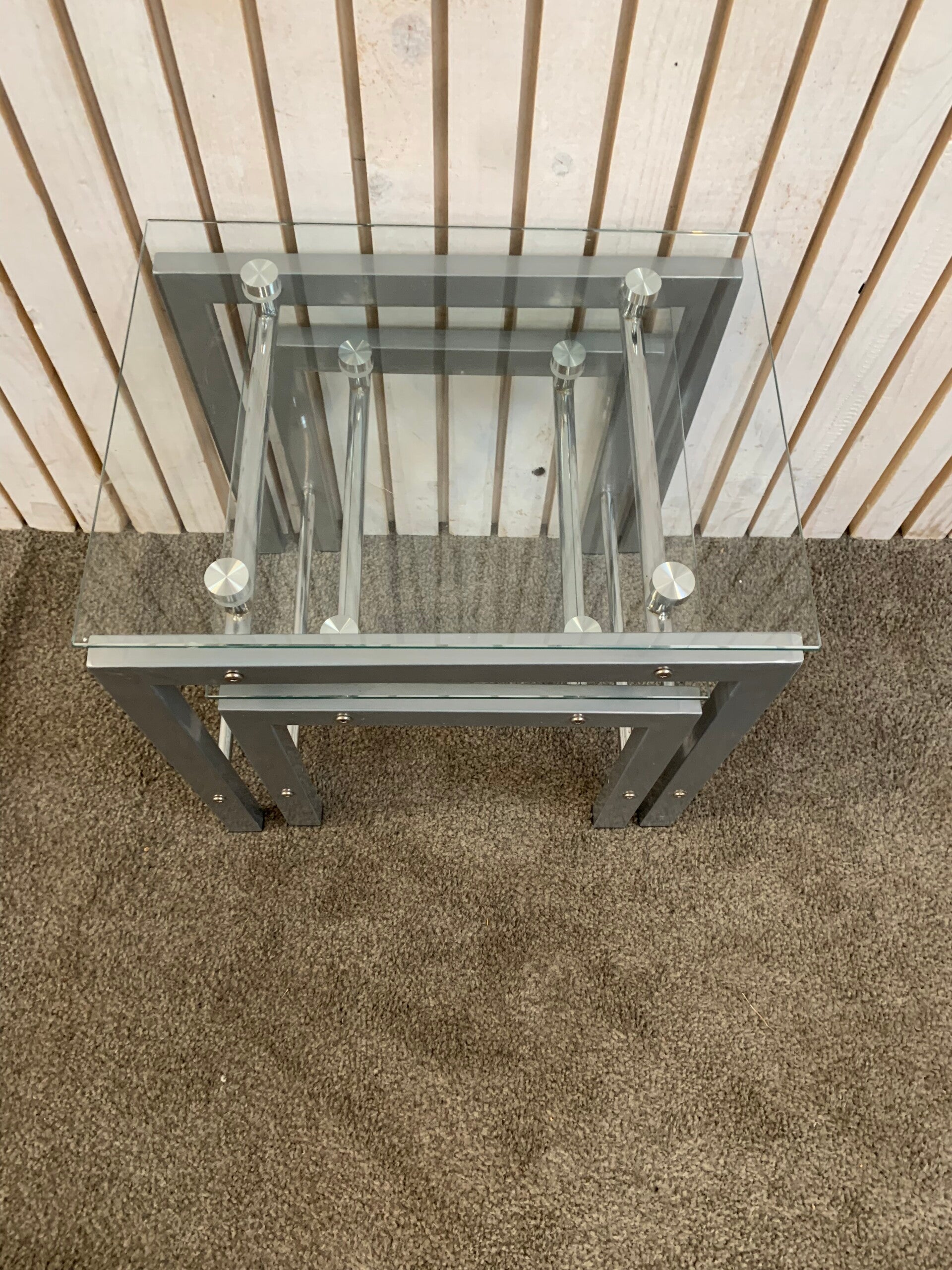 This is a set of 2 Nesting Tables by Nest, featuring a contemporary design with a Rectangular shape. The tables have a Tabletop Material of Metal & Glass, with the tabletop itself made of Glass. The larger table measures 43cm in height, 32cm in length, and 43cm in width. The tables come in a Clear colour and have a stylish Glass and Chrome finish. Now just £18