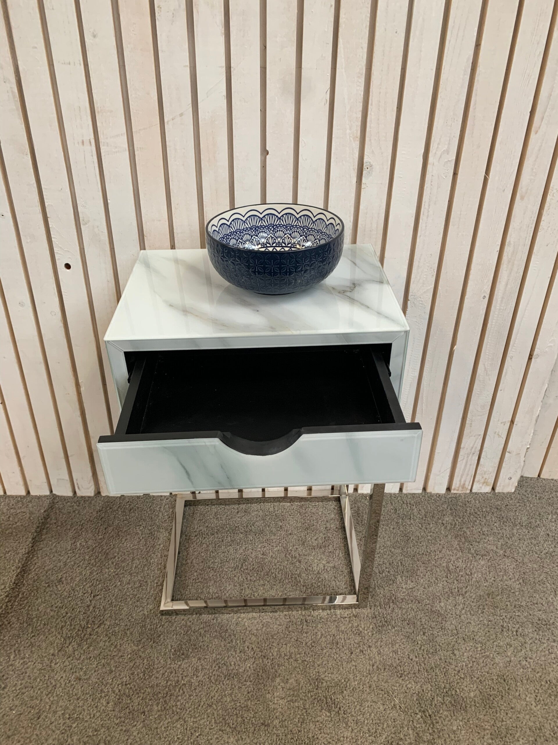 This is a rectangular side table with a glass tabletop in white colour. It has a modern design with a chrome frame, measuring 62cm in height, 31cm in length, and 41cm in width. The table is stylishly crafted with a glass marbel top, providing a sleek and elegant look for any room.