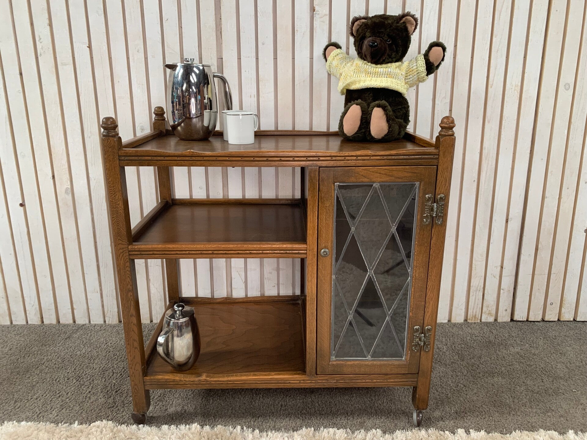 Old Charm's Serving/Wine/Tea Trolley finished in Tudor Brown with 3 shelves and a shelved cupboard with a leaded glass door.The trolley has casters and rolls with ease The trolley is made in the Tudor style of the 1st Elizabethan er Condition The trolley is in good condition with some marks and age related wear.Although the trolley is secondhand it remains fit for everyday use. Please view all photos as they form part of the description. £98