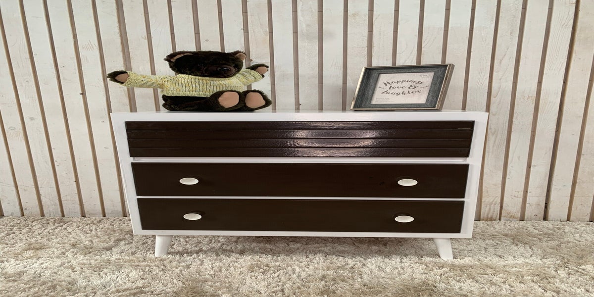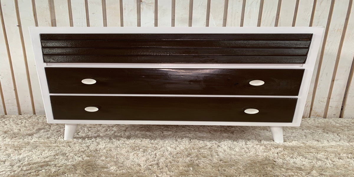 This product is a three drawer chest or bedside cabinet in a stylish brown and white colour scheme. The chest is made of wood, measuring 73cm in height, 61cm in length, and 41cm in width. The white handles add a modern touch to the traditional design, making it a versatile and practical piece of furniture for any bedroom or living space. Ideal for storing clothing, accessories, or decorative items, this chest of drawers combines functionality with a sleek and elegant aesthetic.(320)
