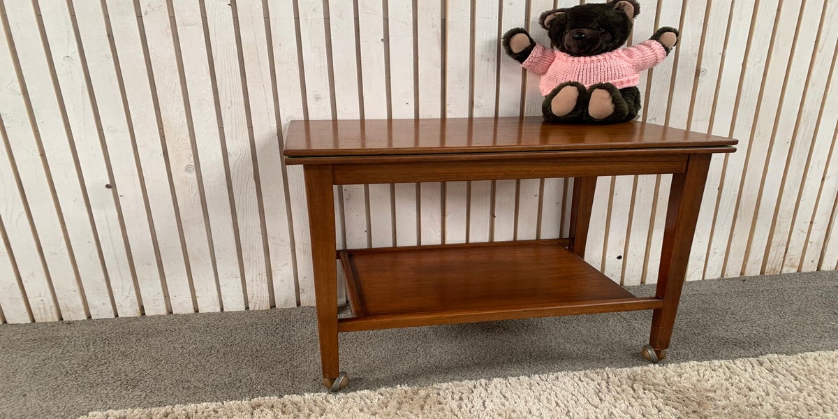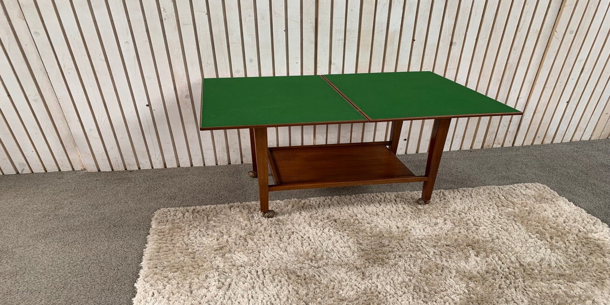 This is a really sweet and useful side table made in the 1960s by the Scottish firm of Eastcraft. The metamorphic action easily transforms to a card table, a place to do jigsaws or even a craft table. The original green felt top is still in excellent condition.There is also a useful shelf below for all your games or craft storage needs, as well as a handy little hidden cubby inside cards etc.