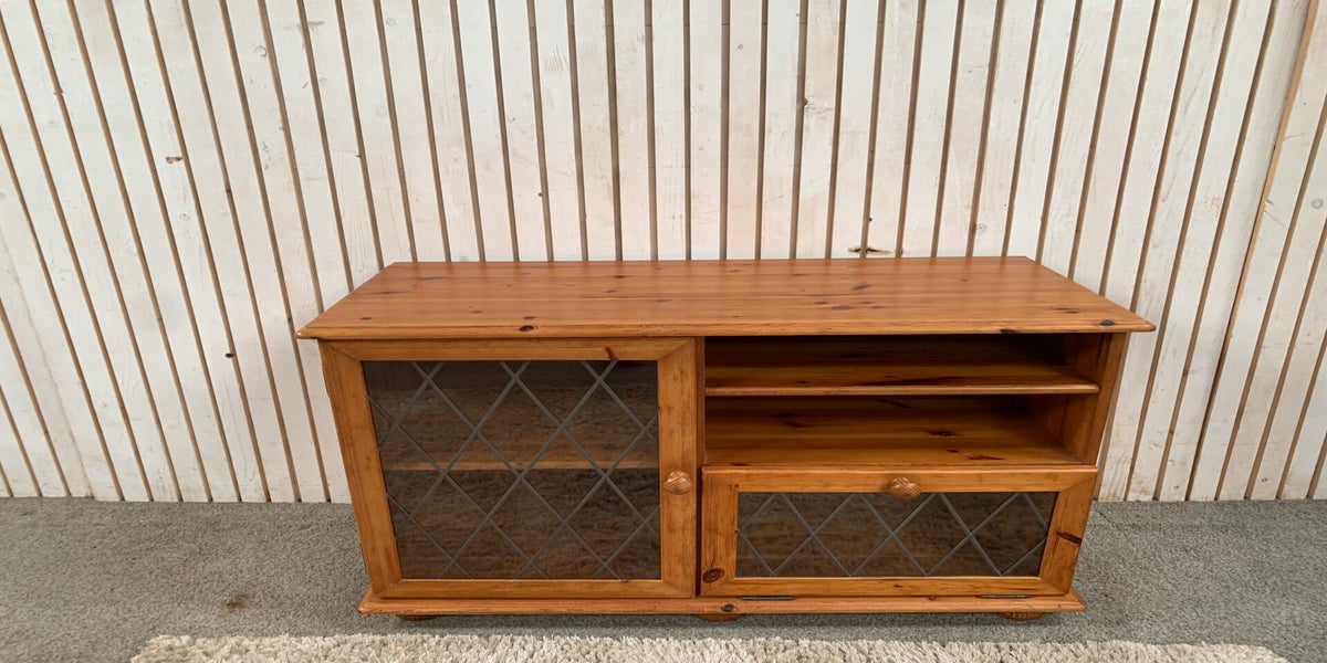 Pine TV units with storage, featuring a cabinet with two glass leaded doors.