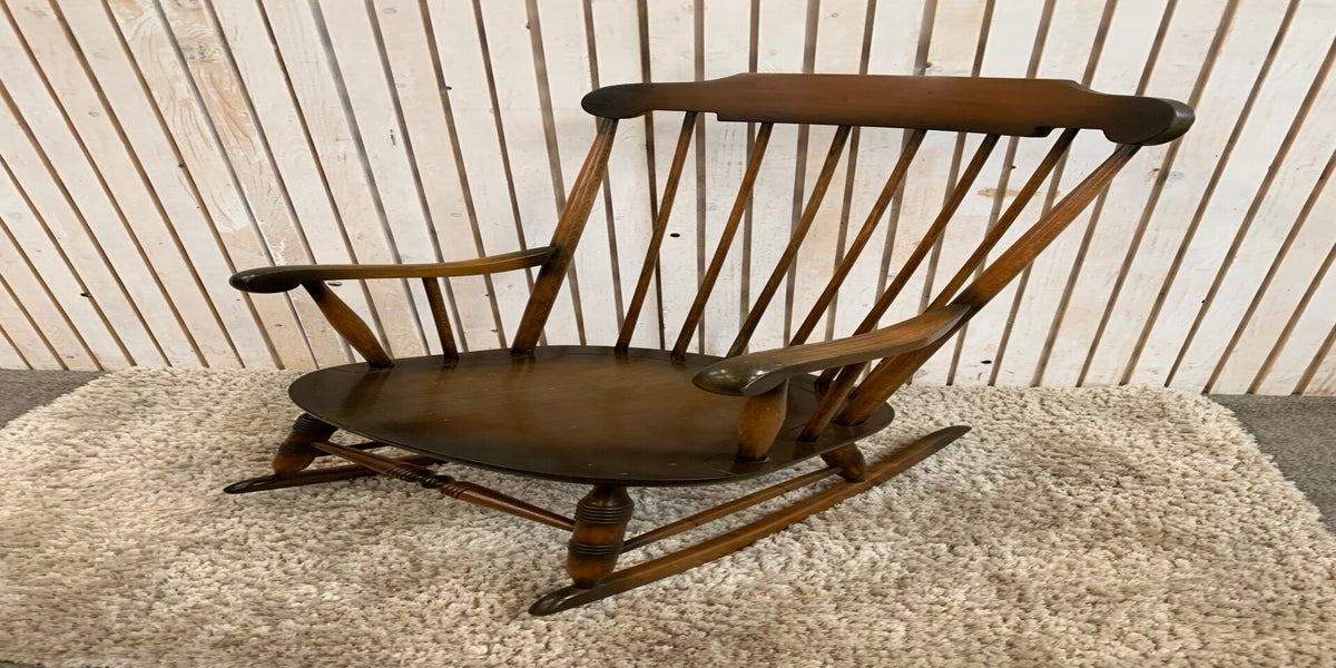 Colonial-style rocking chair with a thin spindle back.