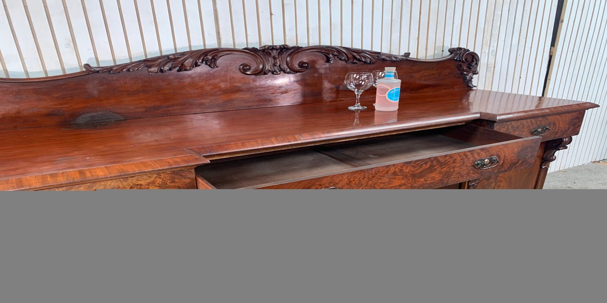 Antique gothic Carved Mahogany style sideboard Base with Mirror and Glass doors.